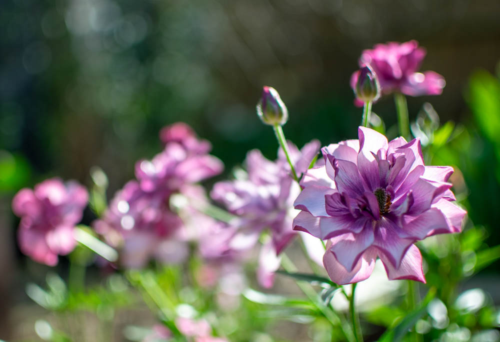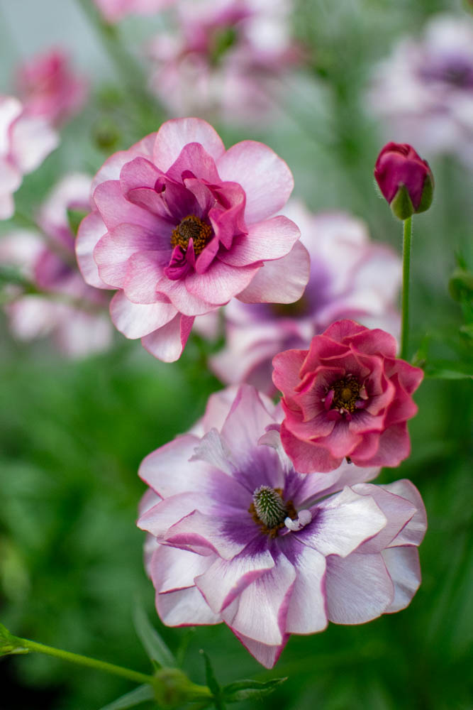 Ranunculus Butterfly™ ‘Thiva’ ® open with darker buds but then paler, silvery lilac, mauve with violet centres appear, you can really see the shimmer on these flowers truly beautiful.